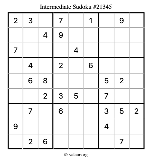 Here is our printable Intermediate Sudoku Puzzle #21345. You are welcome to print a copy for yourself and solve it the old-fashioned way with a pencil and an eraser!