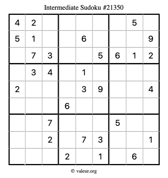 Here is our printable Intermediate Sudoku Puzzle #21350. You are welcome to print a copy for yourself and solve it the old-fashioned way with a pencil and an eraser!
