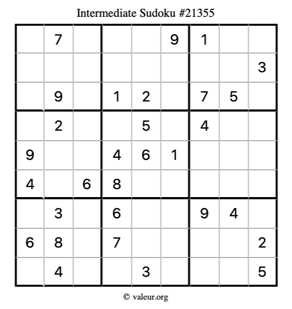 Here is our printable Intermediate Sudoku Puzzle #21355. You are welcome to print a copy for yourself and solve it the old-fashioned way with a pencil and an eraser!
