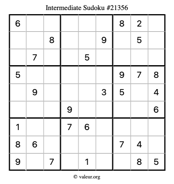 Here is our printable Intermediate Sudoku Puzzle #21356. You are welcome to print a copy for yourself and solve it the old-fashioned way with a pencil and an eraser!