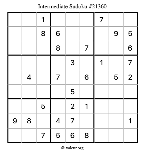 Here is our printable Intermediate Sudoku Puzzle #21360. You are welcome to print a copy for yourself and solve it the old-fashioned way with a pencil and an eraser!
