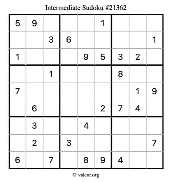 Here is our printable Intermediate Sudoku Puzzle #21362. You are welcome to print a copy for yourself and solve it the old-fashioned way with a pencil and an eraser!