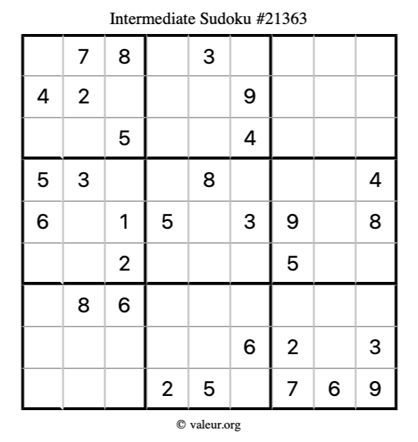 Here is our printable Intermediate Sudoku Puzzle #21363. You are welcome to print a copy for yourself and solve it the old-fashioned way with a pencil and an eraser!