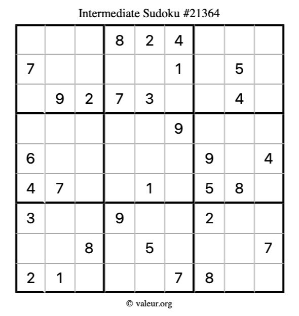Here is our printable Intermediate Sudoku Puzzle #21364. You are welcome to print a copy for yourself and solve it the old-fashioned way with a pencil and an eraser!