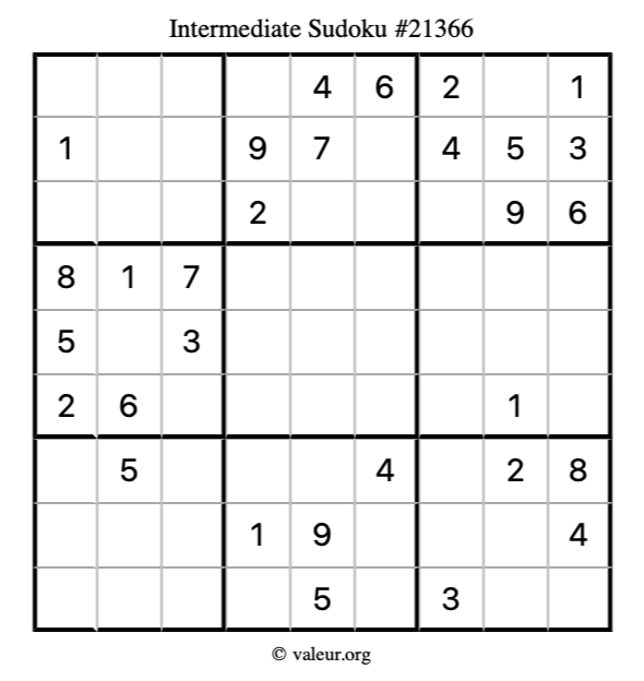 Here is our printable Intermediate Sudoku Puzzle #21366. You are welcome to print a copy for yourself and solve it the old-fashioned way with a pencil and an eraser!