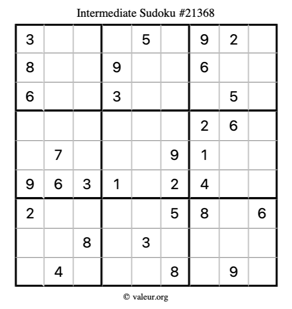 Here is our printable Intermediate Sudoku Puzzle #21368. You are welcome to print a copy for yourself and solve it the old-fashioned way with a pencil and an eraser!