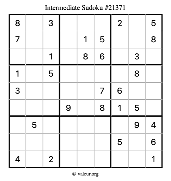 Here is our printable Intermediate Sudoku Puzzle #21371. You are welcome to print a copy for yourself and solve it the old-fashioned way with a pencil and an eraser!