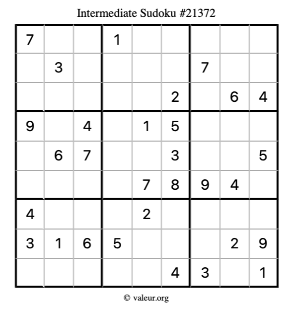 Here is our printable Intermediate Sudoku Puzzle #21372. You are welcome to print a copy for yourself and solve it the old-fashioned way with a pencil and an eraser!