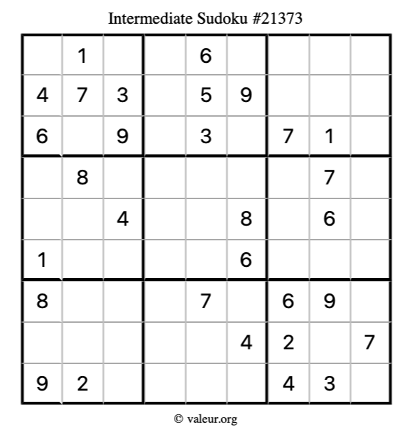 Here is our printable Intermediate Sudoku Puzzle #21373. You are welcome to print a copy for yourself and solve it the old-fashioned way with a pencil and an eraser!