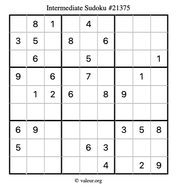 Here is our printable Intermediate Sudoku Puzzle #21375. You are welcome to print a copy for yourself and solve it the old-fashioned way with a pencil and an eraser!