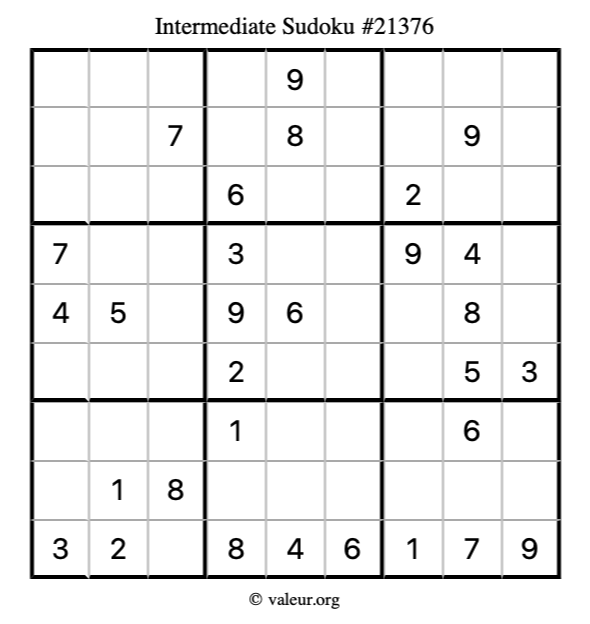 Here is our printable Intermediate Sudoku Puzzle #21376. You are welcome to print a copy for yourself and solve it the old-fashioned way with a pencil and an eraser!