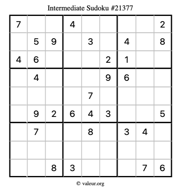 Here is our printable Intermediate Sudoku Puzzle #21377. You are welcome to print a copy for yourself and solve it the old-fashioned way with a pencil and an eraser!