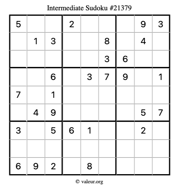 Here is our printable Intermediate Sudoku Puzzle #21379. You are welcome to print a copy for yourself and solve it the old-fashioned way with a pencil and an eraser!