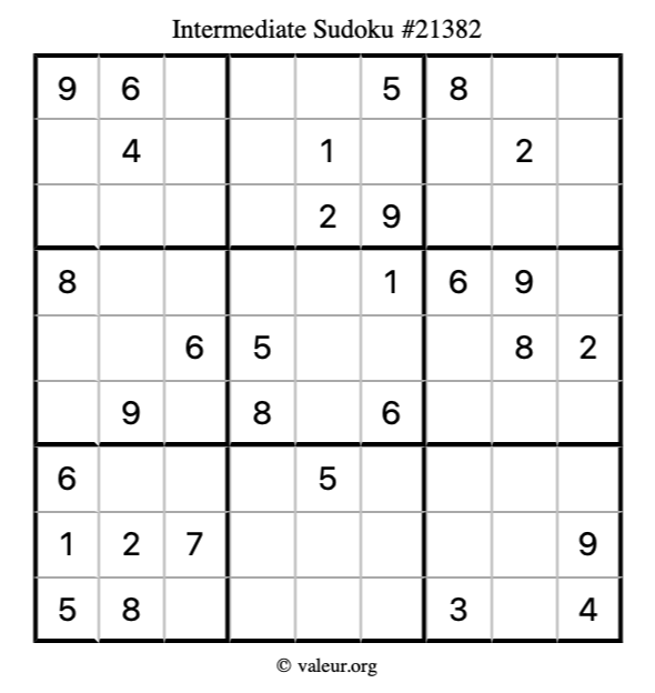 Here is our printable Intermediate Sudoku Puzzle #21382. You are welcome to print a copy for yourself and solve it the old-fashioned way with a pencil and an eraser!