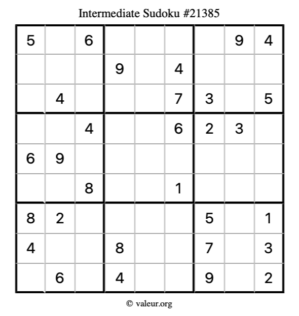 Here is our printable Intermediate Sudoku Puzzle #21385. You are welcome to print a copy for yourself and solve it the old-fashioned way with a pencil and an eraser!