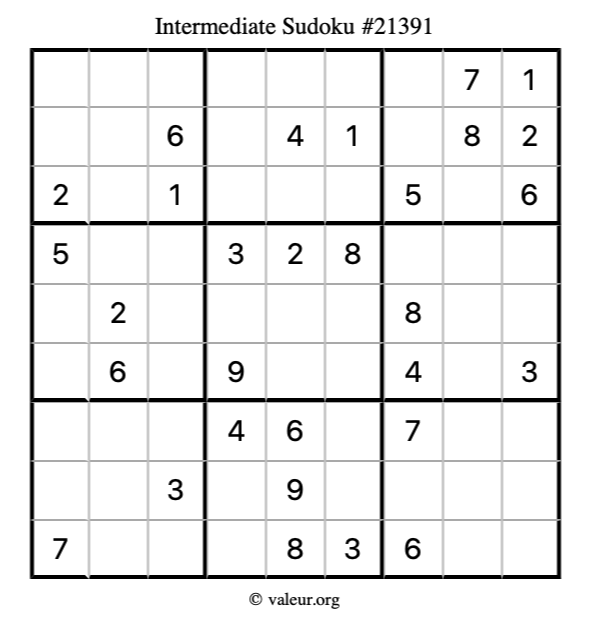 Here is our printable Intermediate Sudoku Puzzle #21391. You are welcome to print a copy for yourself and solve it the old-fashioned way with a pencil and an eraser!