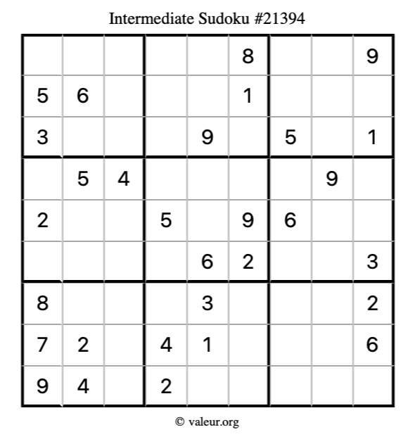 Here is our printable Intermediate Sudoku Puzzle #21394. You are welcome to print a copy for yourself and solve it the old-fashioned way with a pencil and an eraser!