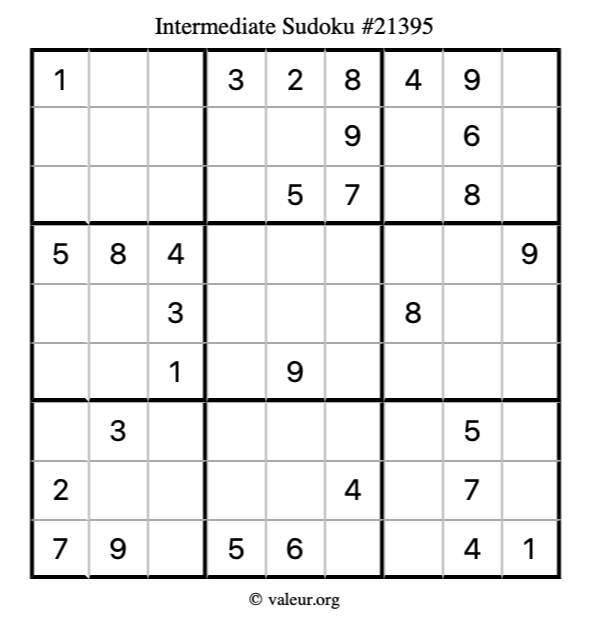 Here is our printable Intermediate Sudoku Puzzle #21395. You are welcome to print a copy for yourself and solve it the old-fashioned way with a pencil and an eraser!