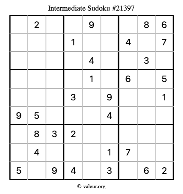 Here is our printable Intermediate Sudoku Puzzle #21397. You are welcome to print a copy for yourself and solve it the old-fashioned way with a pencil and an eraser!