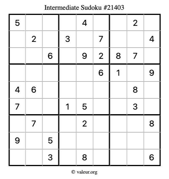 Here is our printable Intermediate Sudoku Puzzle #21403. You are welcome to print a copy for yourself and solve it the old-fashioned way with a pencil and an eraser!