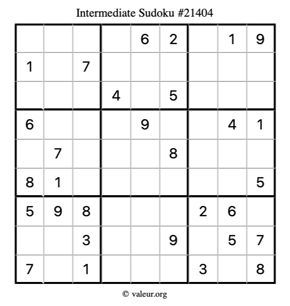 Here is our printable Intermediate Sudoku Puzzle #21404. You are welcome to print a copy for yourself and solve it the old-fashioned way with a pencil and an eraser!
