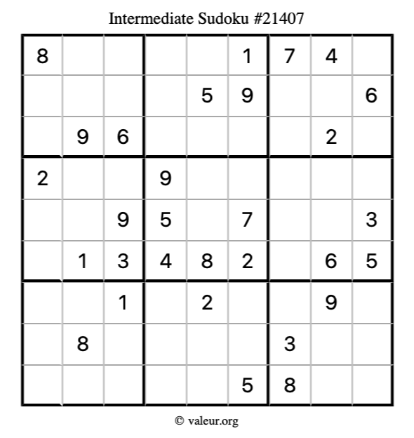 Here is our printable Intermediate Sudoku Puzzle #21407. You are welcome to print a copy for yourself and solve it the old-fashioned way with a pencil and an eraser!