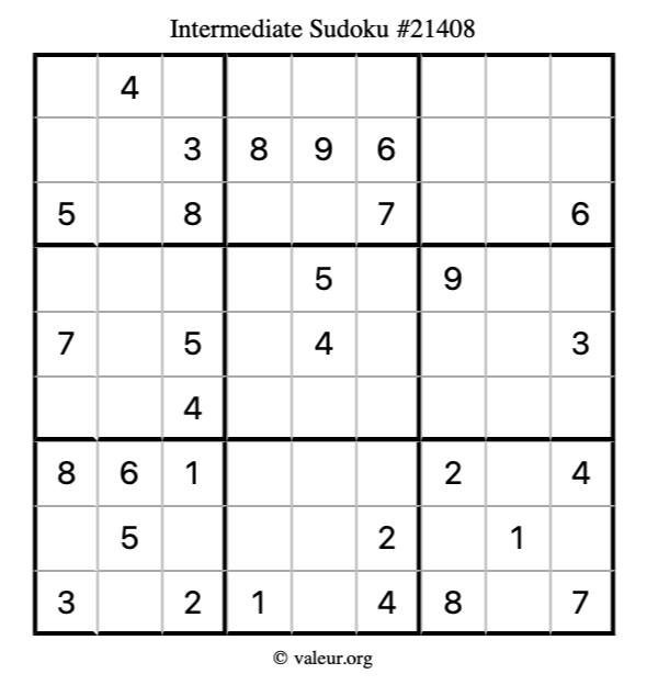 Here is our printable Intermediate Sudoku Puzzle #21408. You are welcome to print a copy for yourself and solve it the old-fashioned way with a pencil and an eraser!