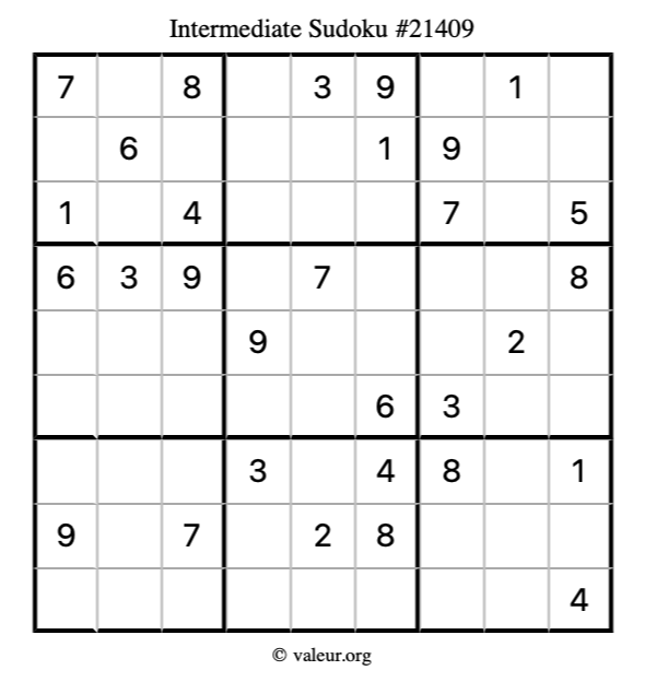 Here is our printable Intermediate Sudoku Puzzle #21409. You are welcome to print a copy for yourself and solve it the old-fashioned way with a pencil and an eraser!
