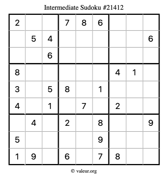 Here is our printable Intermediate Sudoku Puzzle #21412. You are welcome to print a copy for yourself and solve it the old-fashioned way with a pencil and an eraser!
