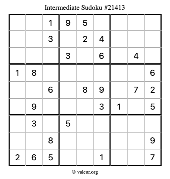 Here is our printable Intermediate Sudoku Puzzle #21413. You are welcome to print a copy for yourself and solve it the old-fashioned way with a pencil and an eraser!
