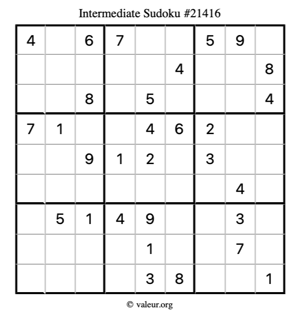 Here is our printable Intermediate Sudoku Puzzle #21416. You are welcome to print a copy for yourself and solve it the old-fashioned way with a pencil and an eraser!