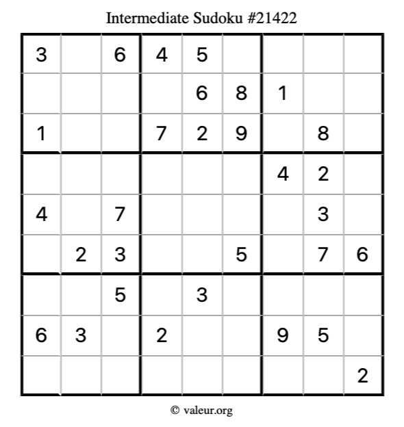 Here is our printable Intermediate Sudoku Puzzle #21422. You are welcome to print a copy for yourself and solve it the old-fashioned way with a pencil and an eraser!