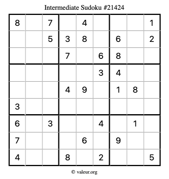 Here is our printable Intermediate Sudoku Puzzle #21424. You are welcome to print a copy for yourself and solve it the old-fashioned way with a pencil and an eraser!