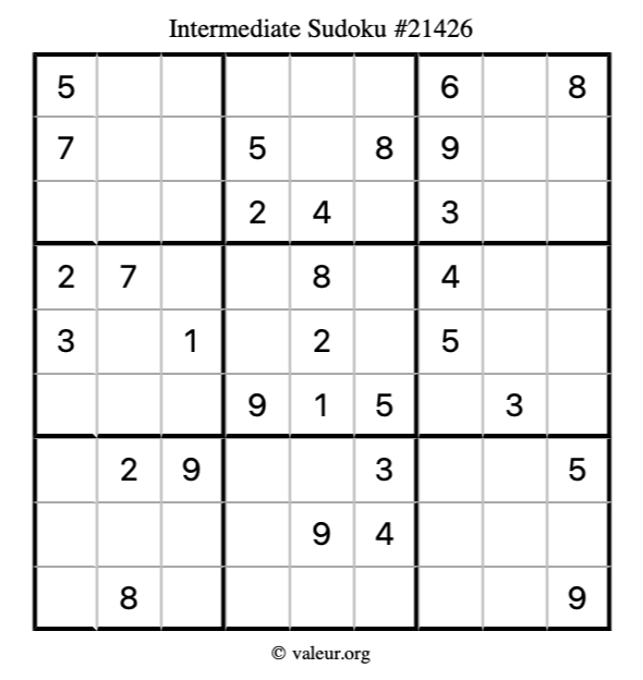 Here is our printable Intermediate Sudoku Puzzle #21426. You are welcome to print a copy for yourself and solve it the old-fashioned way with a pencil and an eraser!