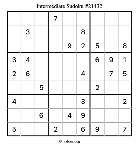Here is our printable Intermediate Sudoku Puzzle #21432. You are welcome to print a copy for yourself and solve it the old-fashioned way with a pencil and an eraser!