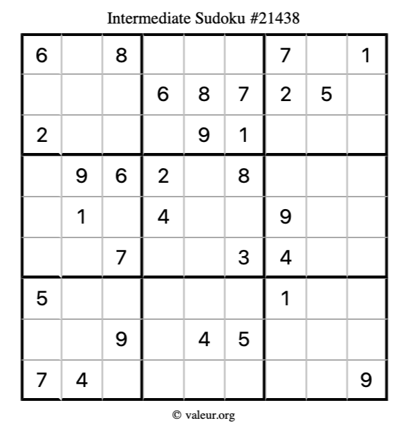 Here is our printable Intermediate Sudoku Puzzle #21438. You are welcome to print a copy for yourself and solve it the old-fashioned way with a pencil and an eraser!