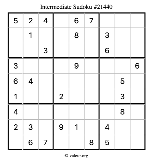 Here is our printable Intermediate Sudoku Puzzle #21440. You are welcome to print a copy for yourself and solve it the old-fashioned way with a pencil and an eraser!