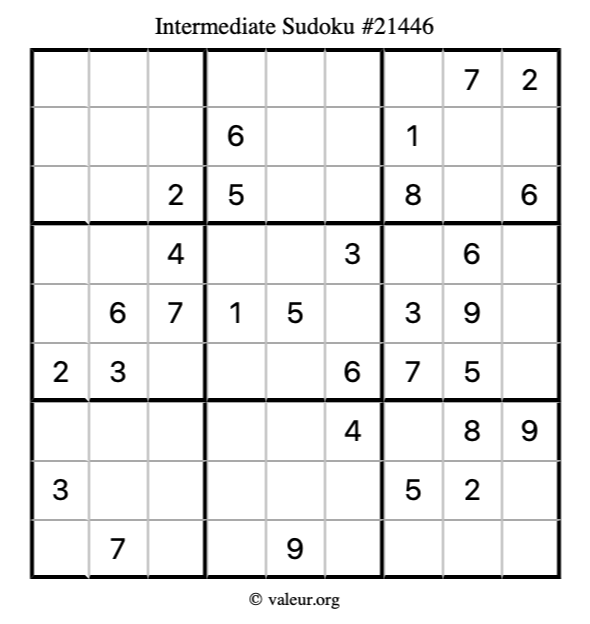 Here is our printable Intermediate Sudoku Puzzle #21446. You are welcome to print a copy for yourself and solve it the old-fashioned way with a pencil and an eraser!