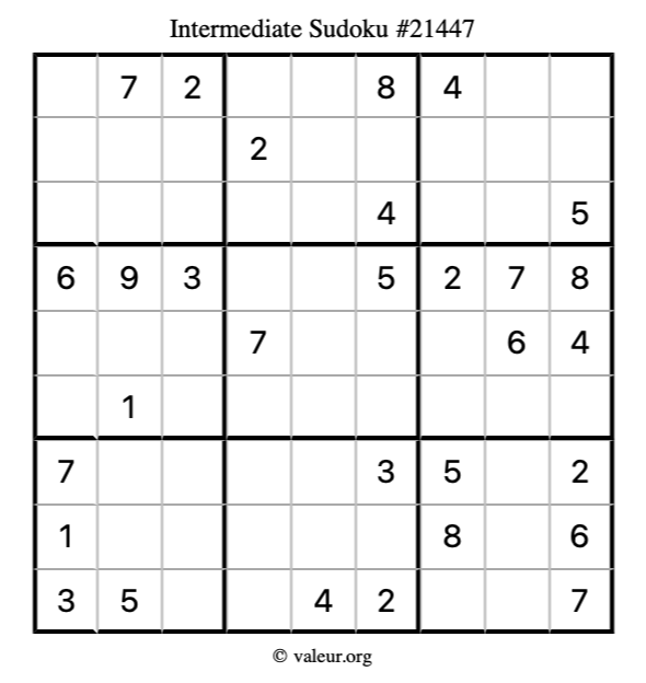 Here is our printable Intermediate Sudoku Puzzle #21447. You are welcome to print a copy for yourself and solve it the old-fashioned way with a pencil and an eraser!