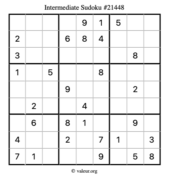 Here is our printable Intermediate Sudoku Puzzle #21448. You are welcome to print a copy for yourself and solve it the old-fashioned way with a pencil and an eraser!
