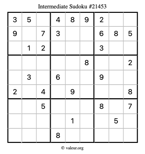 Here is our printable Intermediate Sudoku Puzzle #21453. You are welcome to print a copy for yourself and solve it the old-fashioned way with a pencil and an eraser!