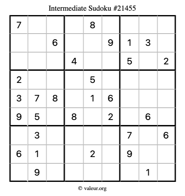 Here is our printable Intermediate Sudoku Puzzle #21455. You are welcome to print a copy for yourself and solve it the old-fashioned way with a pencil and an eraser!