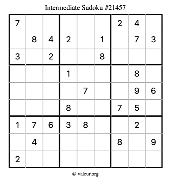 Here is our printable Intermediate Sudoku Puzzle #21457. You are welcome to print a copy for yourself and solve it the old-fashioned way with a pencil and an eraser!