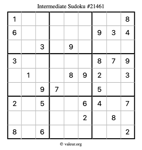 Here is our printable Intermediate Sudoku Puzzle #21461. You are welcome to print a copy for yourself and solve it the old-fashioned way with a pencil and an eraser!