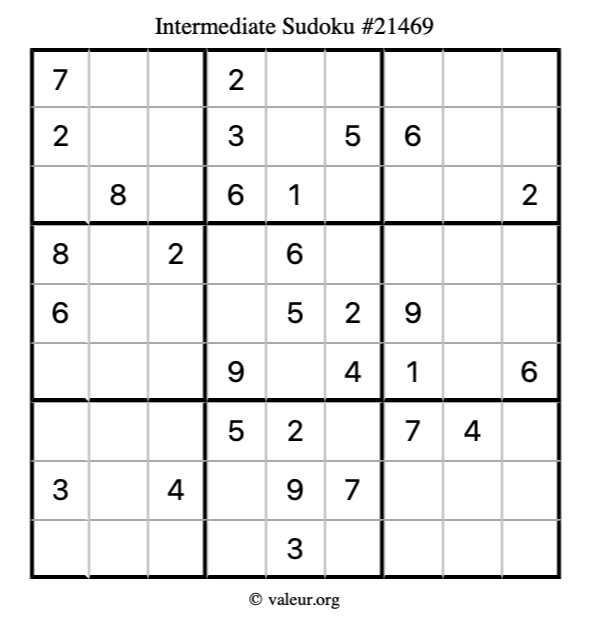 Here is our printable Intermediate Sudoku Puzzle #21469. You are welcome to print a copy for yourself and solve it the old-fashioned way with a pencil and an eraser!