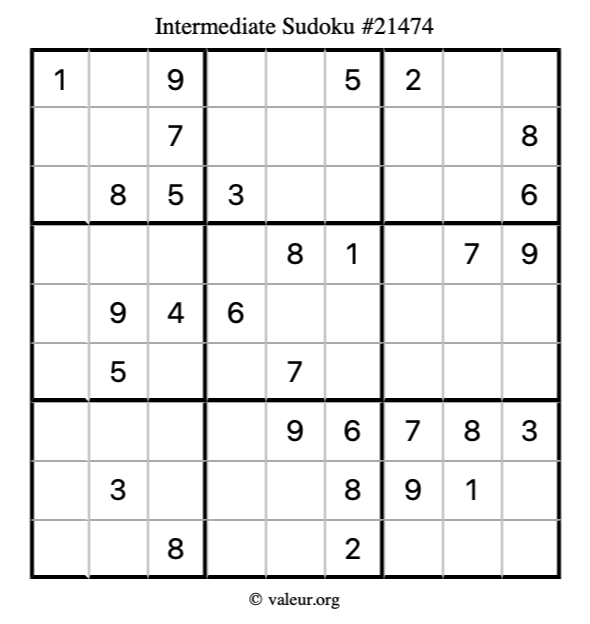 Here is our printable Intermediate Sudoku Puzzle #21474. You are welcome to print a copy for yourself and solve it the old-fashioned way with a pencil and an eraser!