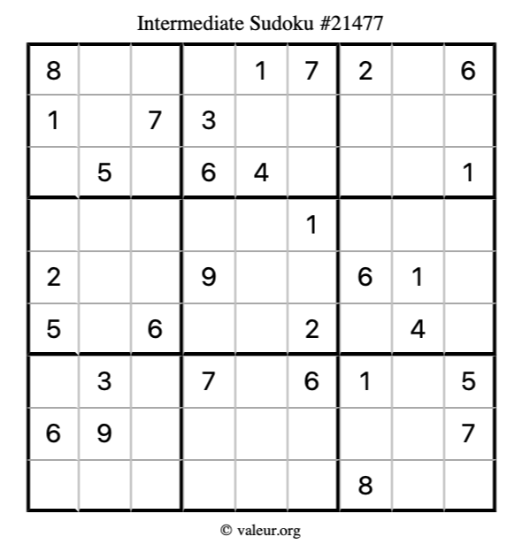 Here is our printable Intermediate Sudoku Puzzle #21477. You are welcome to print a copy for yourself and solve it the old-fashioned way with a pencil and an eraser!