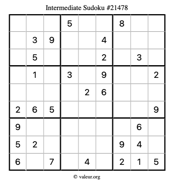 Here is our printable Intermediate Sudoku Puzzle #21478. You are welcome to print a copy for yourself and solve it the old-fashioned way with a pencil and an eraser!