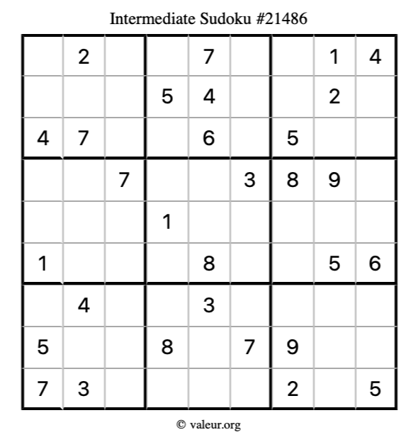 Here is our printable Intermediate Sudoku Puzzle #21486. You are welcome to print a copy for yourself and solve it the old-fashioned way with a pencil and an eraser!
