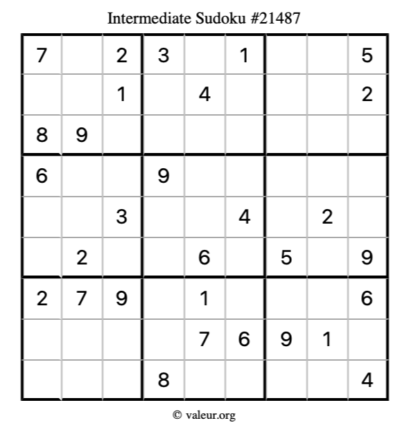 Here is our printable Intermediate Sudoku Puzzle #21487. You are welcome to print a copy for yourself and solve it the old-fashioned way with a pencil and an eraser!